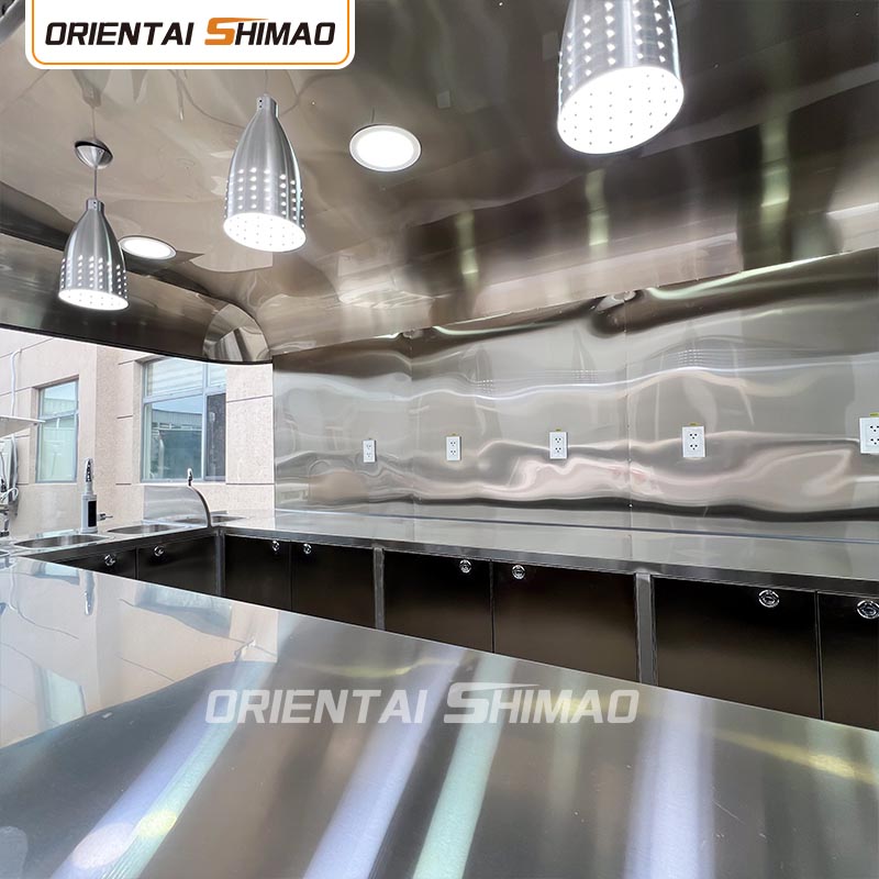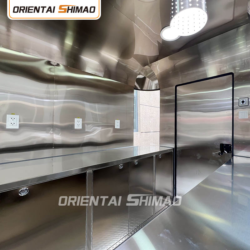 Arany rozsdamentes acél: a food truck külseje kiváló minőségű arany rozsdamentes acélból készült. Ez az anyag nemcsak kiváló korrózió- és kopásállósággal rendelkezik, hanem az aranyszínű megjelenés is növeli a vizuális szépséget és a kiváló minőségű érzetet, így az élelmiszer-teherautó különféle környezetekben is kitűnhet.