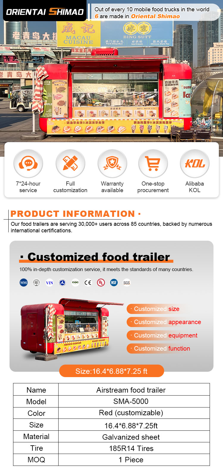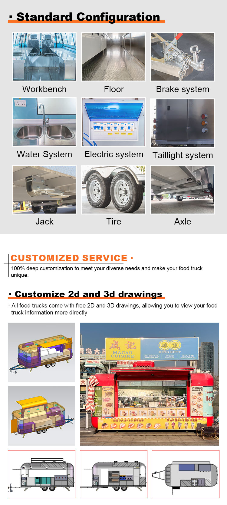 Fő anyagként a kiváló minőségű 304-es rozsdamentes acélt választottuk, amely kiváló korrózióállóságáról és kiváló tartósságáról ismert, és stabil teljesítményt képes fenntartani különféle környezeti körülmények között, biztosítva, hogy Food Catering Trailers termékeink hosszú távon is megőrizzék kiváló minőségüket és funkcionalitásukat, és számos kihívással nézzenek szembe. A 304-es rozsdamentes acél kiváló korrózióállósága, így a teherautót nem éri könnyen oxidáció vagy rozsda, ami jelentősen meghosszabbítja az élettartamát. A 304-es rozsdamentes acél kiváló korrózióállósága miatt a teherautó kevésbé érzékeny az oxidációra vagy a rozsdára, ami jelentősen meghosszabbítja élettartamát.