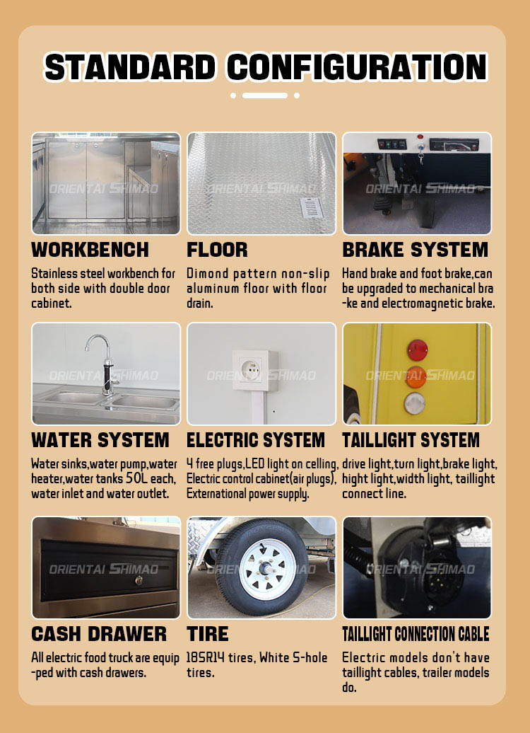 Forró értékesítésű elektromos élelmiszer-pótkocsi, kiváló minőségű horganyzott acéllemez és szálas üveg anyagokkal. Festés testreszabható speciális kötelezővel. A szekrényben lévő munkapadot 304 rozsdamentes acélból készítik, a padlót nem csúszás alumínium készíti.