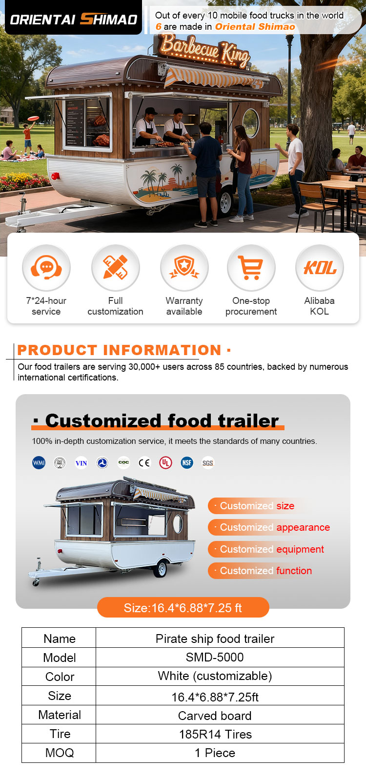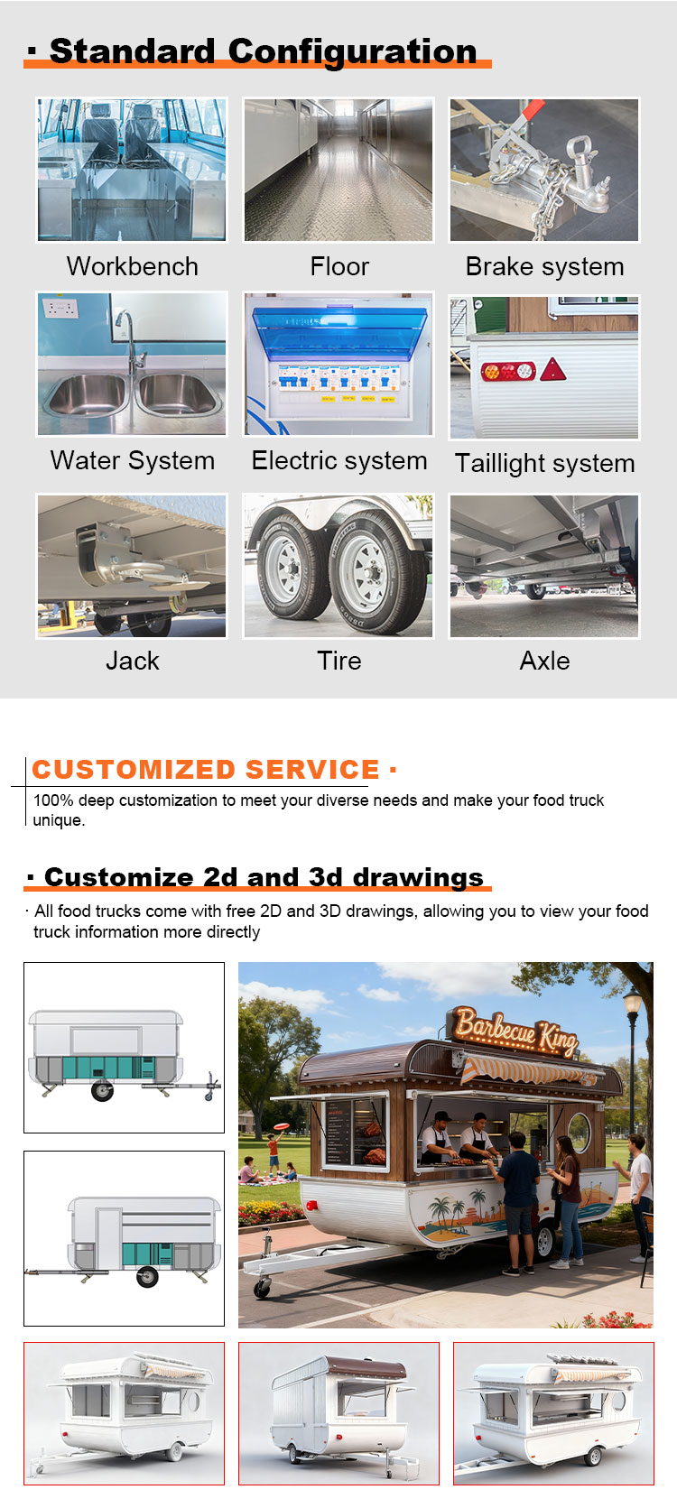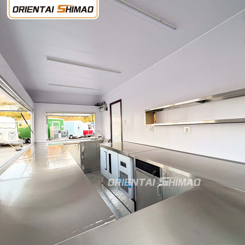 Fő anyagként a kiváló minőségű 304-es rozsdamentes acélt választottuk, amely kiváló korrózióállóságáról és kiváló tartósságáról ismert, és stabil teljesítményt képes fenntartani különféle környezeti körülmények között, biztosítva, hogy Food Catering Trailers termékeink hosszú távon is megőrizzék kiváló minőségüket és funkcionalitásukat, és számos kihívással nézzenek szembe. A 304-es rozsdamentes acél kiváló korrózióállósága, így a teherautót nem éri könnyen oxidáció vagy rozsda, ami jelentősen meghosszabbítja az élettartamát. A 304-es rozsdamentes acél kiváló korrózióállósága miatt a teherautó kevésbé érzékeny az oxidációra vagy a rozsdára, ami jelentősen meghosszabbítja élettartamát.