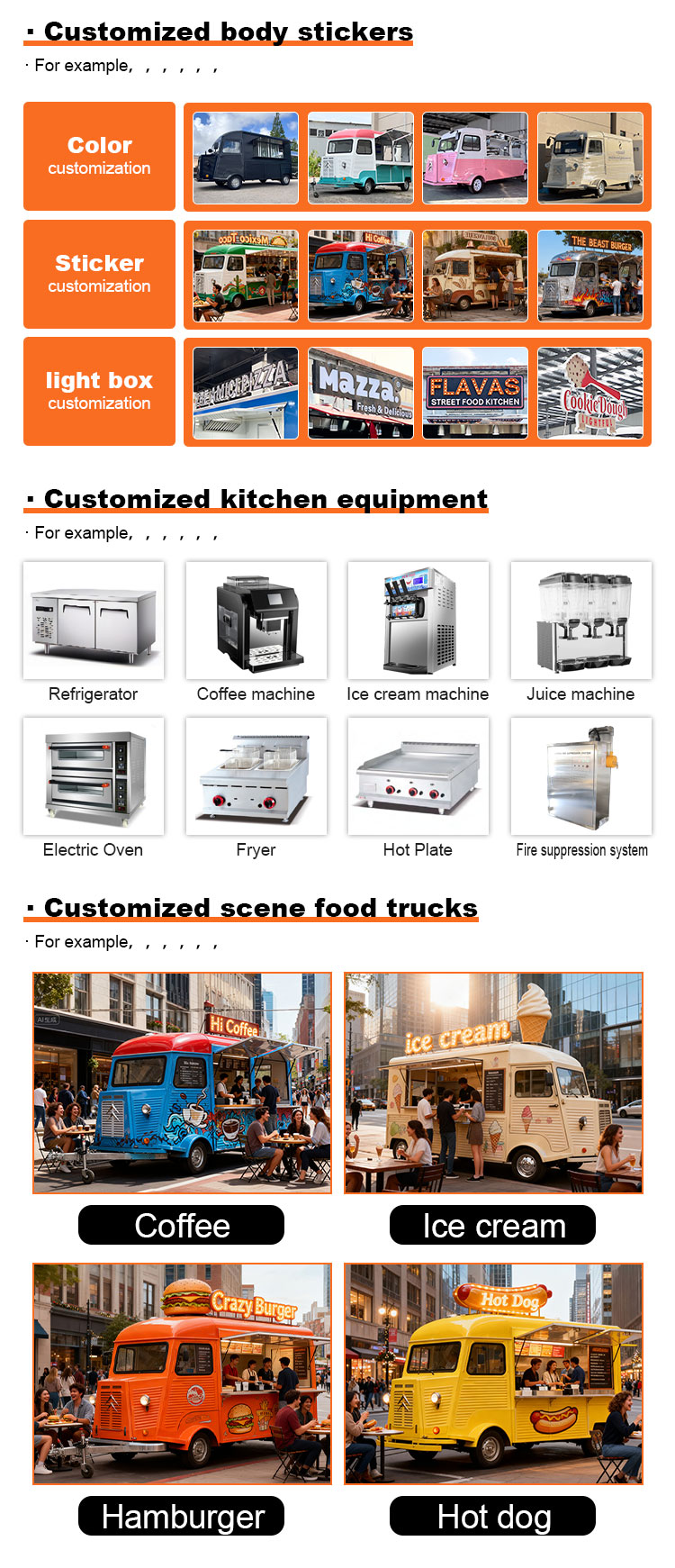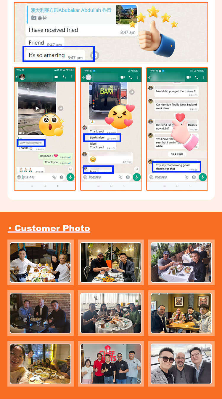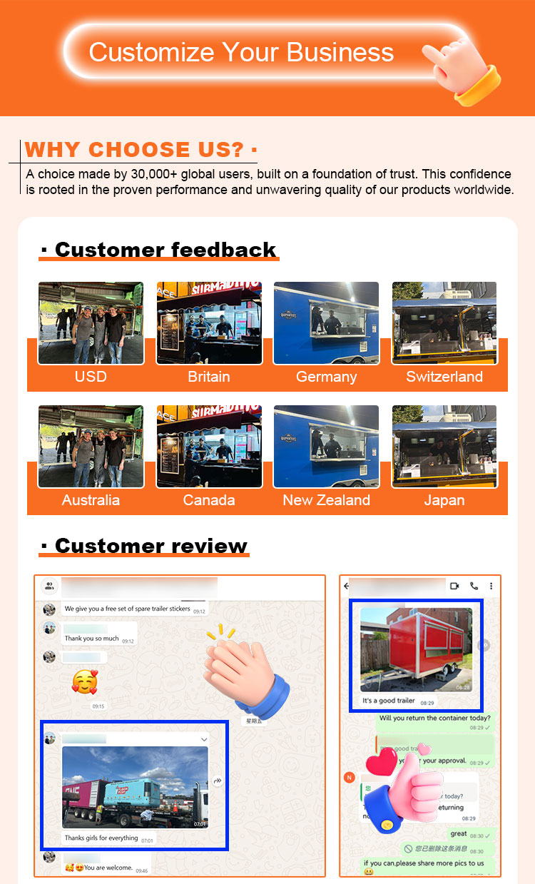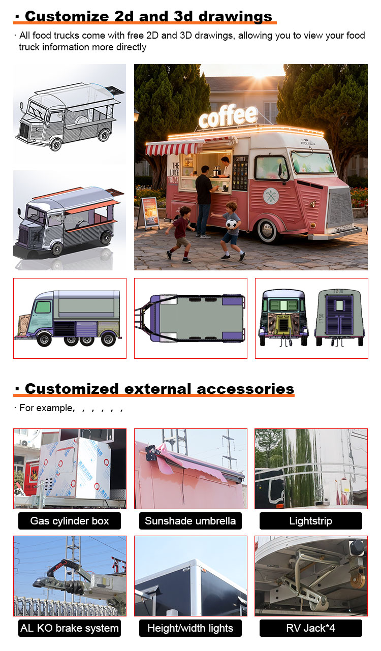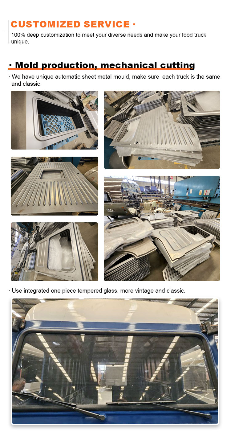 Fő anyagként a kiváló minőségű 304-es rozsdamentes acélt választottuk, amely kiváló korrózióállóságáról és kiváló tartósságáról ismert, és stabil teljesítményt tud fenntartani különféle környezeti körülmények között, biztosítva, hogy Trailer Food Truck termékeink hosszú távon is megőrizzék kiváló minőségüket és funkcionalitásukat, és számos kihívással nézzenek szembe. A 304-es rozsdamentes acél kiváló korrózióállósága, így a teherautót nem éri könnyen oxidáció vagy rozsda, ami jelentősen meghosszabbítja az élettartamát. A 304-es rozsdamentes acél kiváló korrózióállósága miatt a teherautó kevésbé érzékeny az oxidációra vagy a rozsdára, ami jelentősen meghosszabbítja élettartamát.