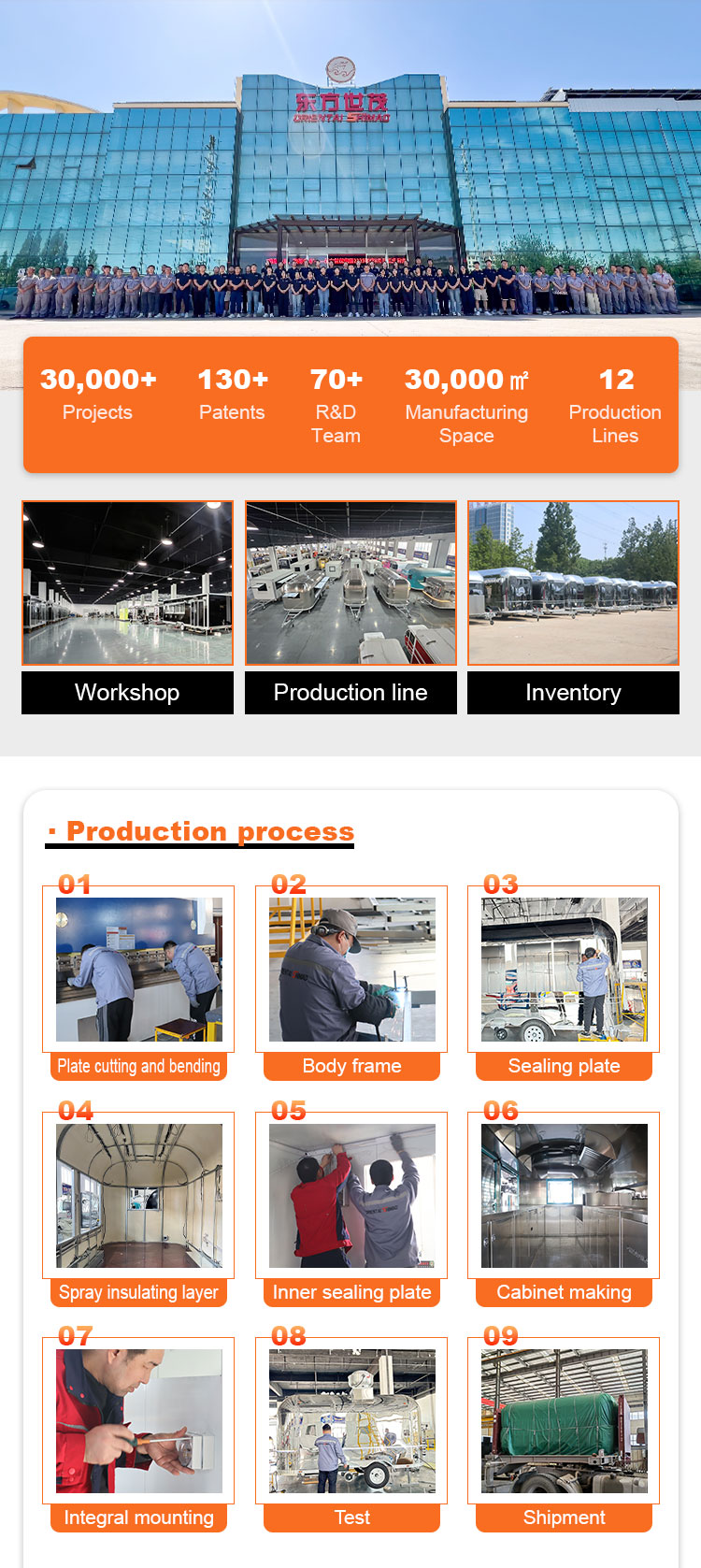 Az igényelemzéstől és az egyedi tervezéstől, az anyagválasztástól és -beszerzéstől, a gyártástól, a belső berendezések beszerelésétől, a külső dekorációtól és jelzésektől, a teszteléstől és a minőség-ellenőrzéstől, a forgalmazástól és a telepítéstől az értékesítés utáni szolgáltatásig és karbantartásig minden lépésnél Önnel állunk.