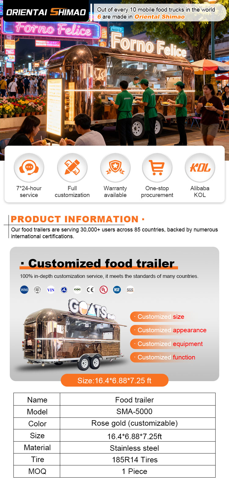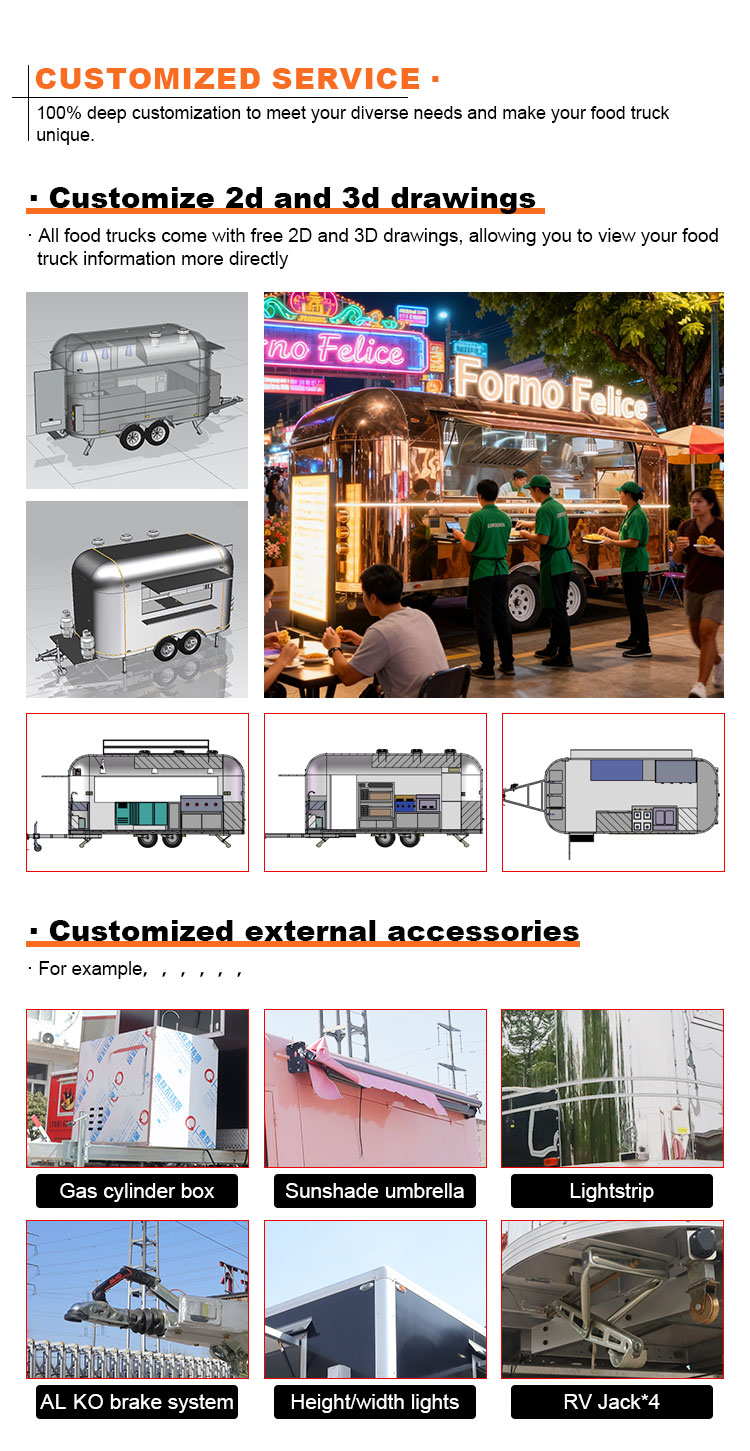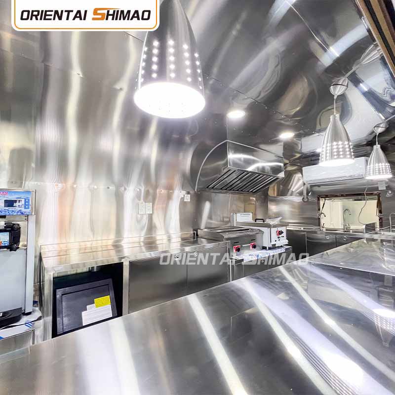Fő anyagként a kiváló minőségű 304-es rozsdamentes acélt választottuk, amely kiváló korrózióállóságáról és kiváló tartósságáról ismert, és stabil teljesítményt képes fenntartani különféle környezeti körülmények között, biztosítva, hogy Food Catering Trailers termékeink hosszú távon is megőrizzék kiváló minőségüket és funkcionalitásukat, és számos kihívással nézzenek szembe. A 304-es rozsdamentes acél kiváló korrózióállósága, így a teherautót nem éri könnyen oxidáció vagy rozsda, ami jelentősen meghosszabbítja az élettartamát. A 304-es rozsdamentes acél kiváló korrózióállósága miatt a teherautó kevésbé érzékeny az oxidációra vagy a rozsdára, ami jelentősen meghosszabbítja élettartamát.