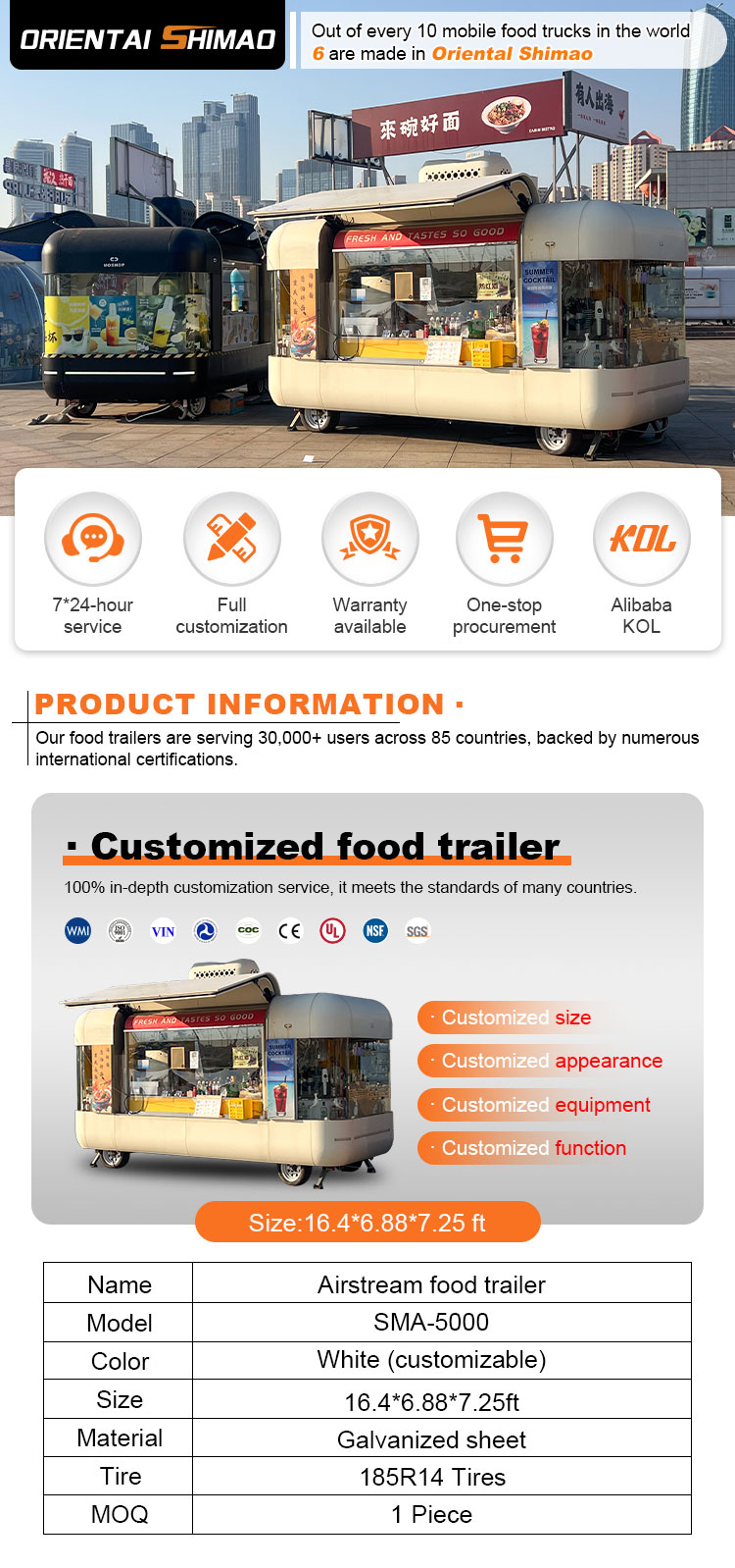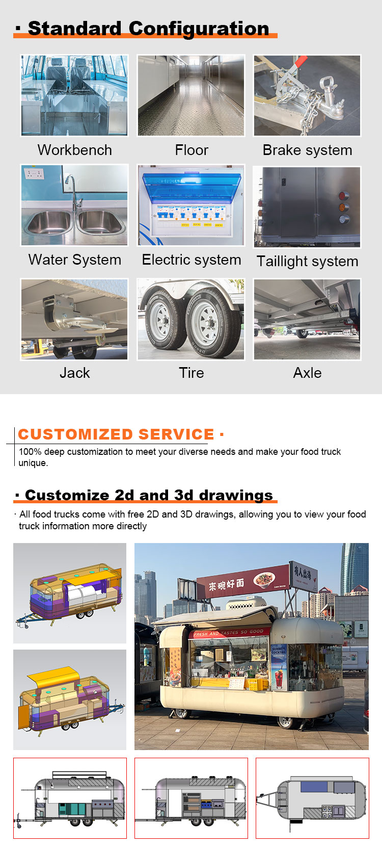 Fő anyagként a kiváló minőségű 304-es rozsdamentes acélt választottuk, amely kiváló korrózióállóságáról és kiváló tartósságáról ismert, és stabil teljesítményt képes fenntartani különféle környezeti körülmények között, biztosítva, hogy Food Catering Trailers termékeink hosszú távon is megőrizzék kiváló minőségüket és funkcionalitásukat, és számos kihívással nézzenek szembe. A 304-es rozsdamentes acél kiváló korrózióállósága, így a teherautót nem éri könnyen oxidáció vagy rozsda, ami jelentősen meghosszabbítja az élettartamát. A 304-es rozsdamentes acél kiváló korrózióállósága miatt a teherautó kevésbé érzékeny az oxidációra vagy a rozsdára, ami jelentősen meghosszabbítja élettartamát.