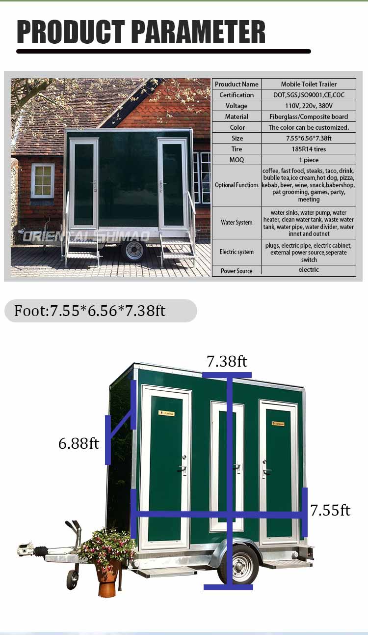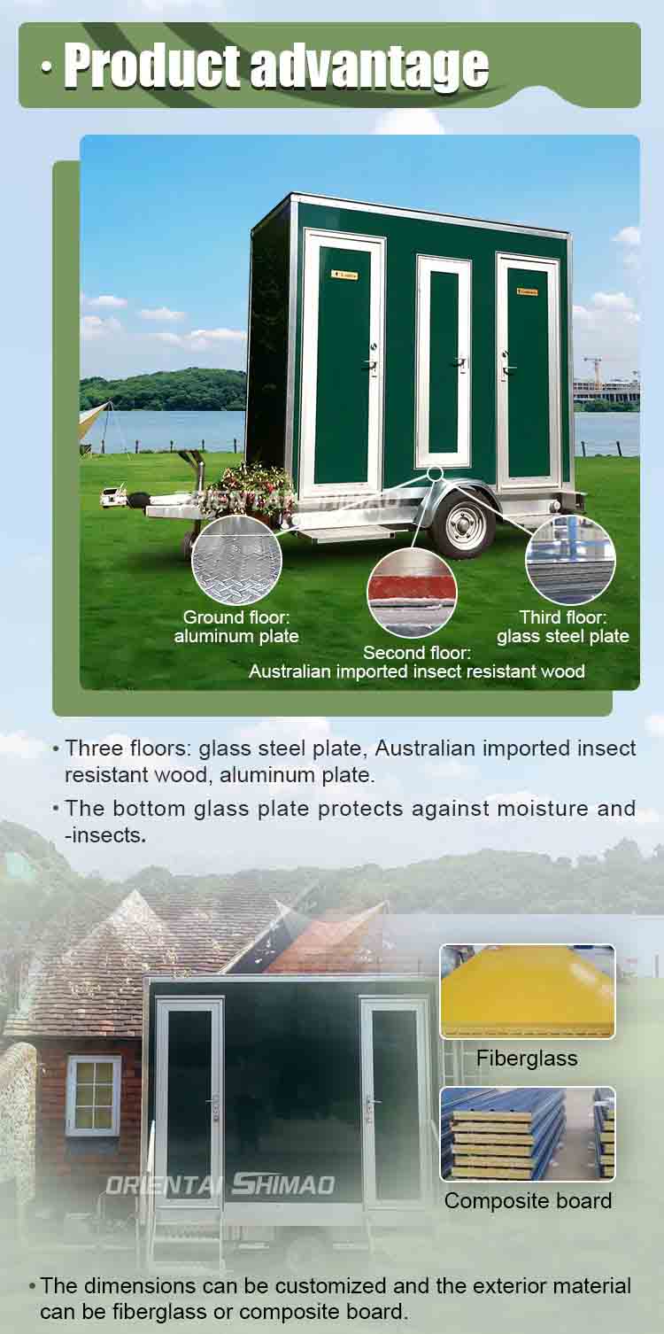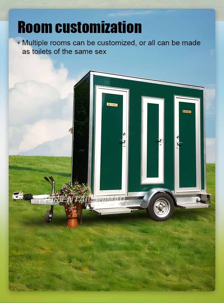 · Erőteljes mobilteljesítmény: Ez a mobil WC-ház nagy teljesítményű gumiabroncsokkal és megerősített felfüggesztési rendszerrel van felszerelve, hogy biztosítsa, hogy könnyen megbirkózzon mindenféle terepen, és stabilan és biztonságosan áthelyezhető és elhelyezhető, akár egy sáros építkezésen, akár egy robusztus kültéri helyszínen.