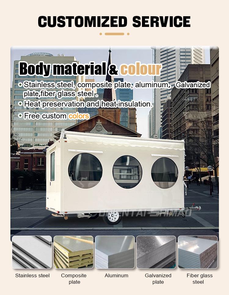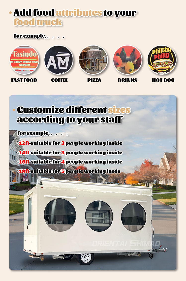 Modellezés és stílus: a food truck megjelenésének modellezése és stílusa fontos tényező a vásárlók vonzásában. Testreszabható az ügyfelek márkaképének, üzleti jellemzőinek vagy személyes preferenciáinak megfelelően, mint például a letisztult design, a retro stílus, a modern egyszerűség és így tovább.