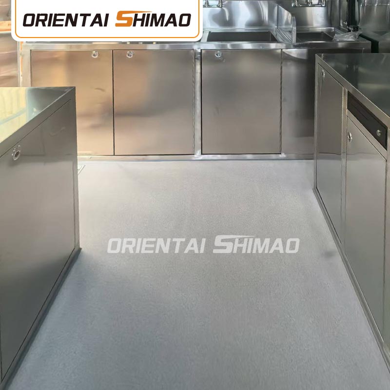 Háromrétegű padló: A food truck padlózata három rétegű. A felső réteg egy alumínium padló, csúszásmentes felülettel a kezelők biztonsága érdekében; a középső réteg Ausztráliából importált rovarálló fatábla; az alsó réteg pedig üvegszál erősítésű műanyag, amely nedvesség- és rovarálló és meghosszabbítja a padló élettartamát.
