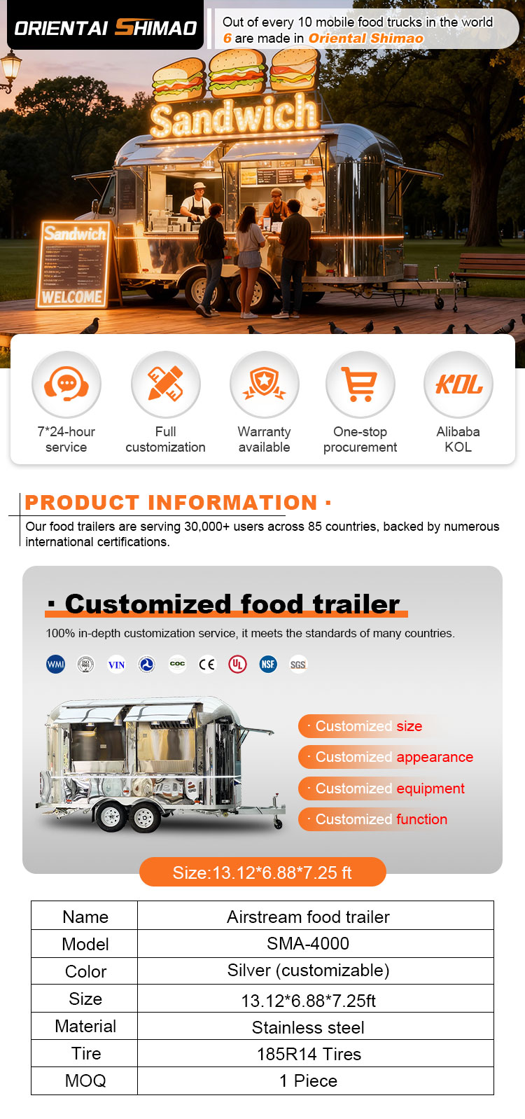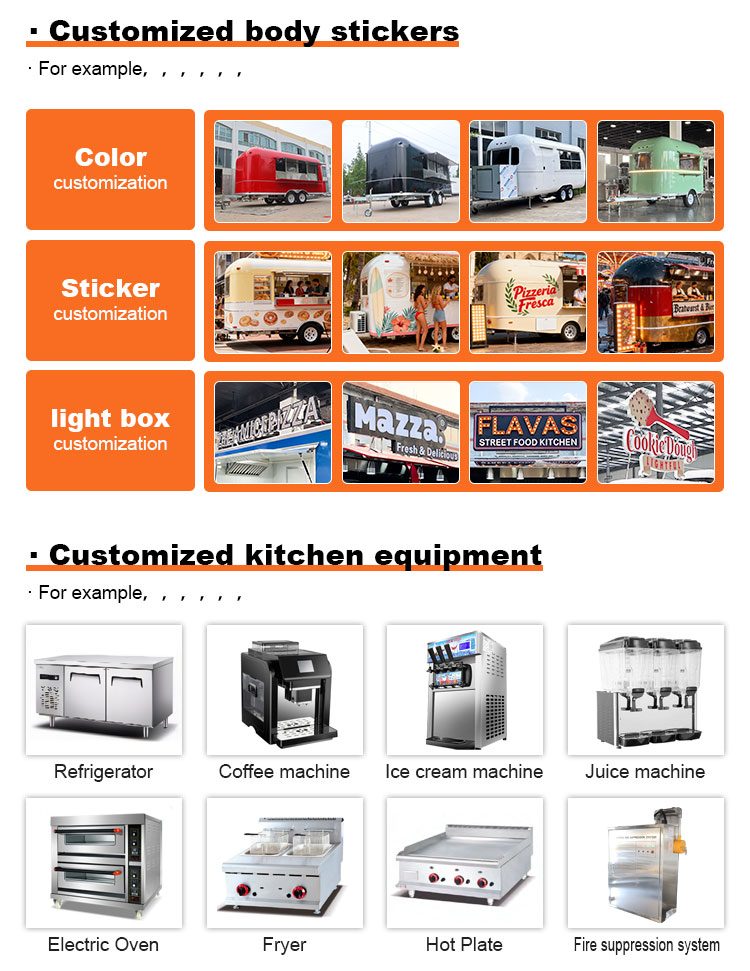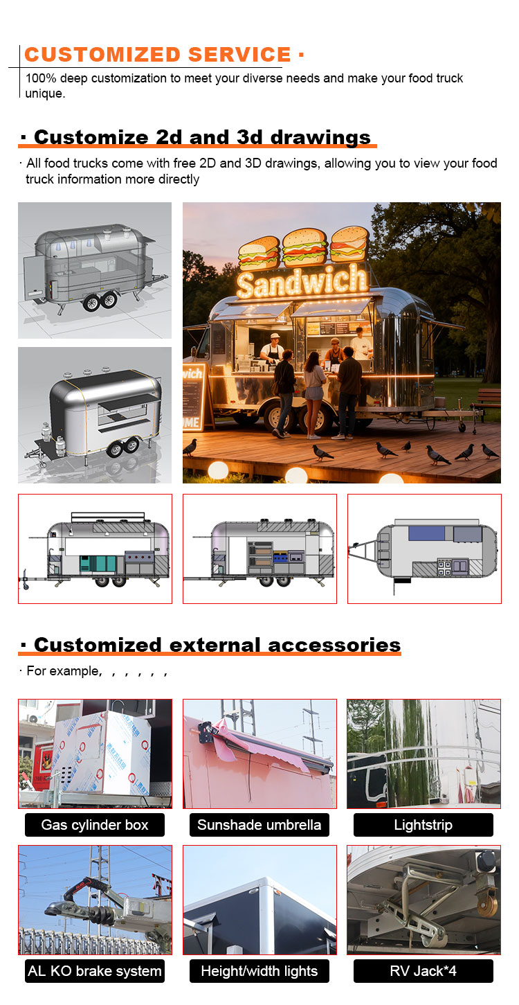 Fő anyagként a kiváló minőségű 304-es rozsdamentes acélt választottuk, amely kiváló korrózióállóságáról és kiváló tartósságáról ismert, és stabil teljesítményt tud fenntartani különféle környezeti körülmények között, biztosítva, hogy Trailer Food Truck termékeink hosszú távon is megőrizzék kiváló minőségüket és funkcionalitásukat, és számos kihívással nézzenek szembe. A 304-es rozsdamentes acél kiváló korrózióállósága, így a teherautót nem éri könnyen oxidáció vagy rozsda, ami jelentősen meghosszabbítja az élettartamát. A 304-es rozsdamentes acél kiváló korrózióállósága miatt a teherautó kevésbé érzékeny az oxidációra vagy a rozsdára, ami jelentősen meghosszabbítja élettartamát.